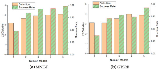 Figure 6. As is shown in the figure, with the increase of the number of substitute models, the success rate grows fast. On the other hand, the distortion increases with the substitute models, which is not good news for us. Thus, how to balance success rate and distortion is a vital problem, and we should choose the proper number of substitute models according to the situation.
