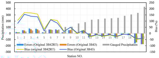 The average RMSD of the original 3B42RT and 3B43 in the Qaidam Basin is 72.25 mm and 64.24 mm, respectively. Considering with the bias together, the minimum RMSD (23.17 mm of 3B43RT and 18.42mm of 3B43) relates to the overestimation (bias of 106.79%, 82.07% and value of 21.26 mm, 16.31 mm) of 3B42RT and 3B43 in the LGPA (LH station), while the maximum RMSD (189.76 mm of 3B43RT and 187.08 mm of 3B43) relates to the underestimation (bias of –40.49%, –40.20% and value of –175.04 mm, –174.09 mm) in the HGPA (CHH station). It is obvious that the bias of underestimation is smaller than that of overestimation, but the absolute amount of underestimation is far greater than that of overestimation, as shown in Figure 3. Therfore, it is supposed that the average TRMM precipitation in the Qaidam Basin would be an underestimation overall.