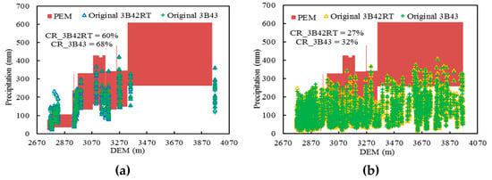 Most of the grids have no ground gauge so that we could not evaluate the precision by precipitation itself. Some other validation principle is introduced. Here, it is the consistency principle (CR), which is a relationship rule of rainfall and elevation retrieved from the gauged data. The situation of 3B42RT and 3B43 precipitation falling into the PEM is shown in Figure 4.