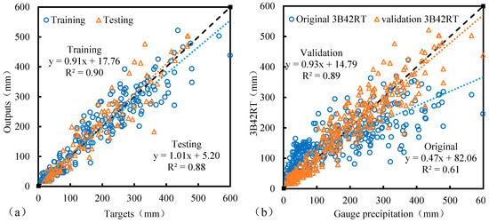 It can be seen from Figure 5a,c that the training and testing are very good with the determinant coefficients 0.90, 0.91 and 0.88, 0.90, respectively. There was also improvement with the determinant coefficients 0.89, 0.91 of corrected TRMM precipitation compared with the original TRMM determinant coefficients of 0.61, 0.70. It also can be seen that the values of original 3B42RT and 3B43 are all mostly above the 1:1 line when gauged precipitation was less than 100 mm, while a lot of the values of original TRMM precipitation are under the 1:1 line when gauged precipitation was more than 200 mm. This indicates that the original TRMM precipitation in the LGPA was overestimated and the TRMM precipitation in the HGPA was underestimated. On the whole, the dispersion of TRMM precipitation points on both sides of the 1:1 line is large and uneven, the R2 is only 0.61 and 0.70, respectively. Fortunately, the 3B42RT and 3B43 precipitation improved significantly both in the LGPA and HGPA. They closely dispersed on the both sides of the 1:1 line after the correction by the ANN model. The R2 increased to 0.89 and 0.91, respectively. It was proven that the fusion model based on an ANN is effective for the correction of TRMM products.