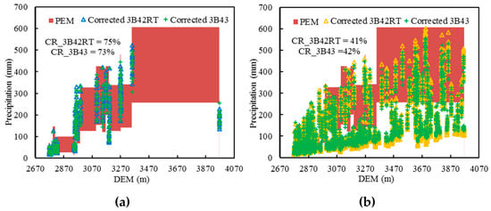 The consistency rate (CR) elevation for corrected TRMM from 2001 to 2016 in the Qaidam Basin. (a) Gauged grids. (b) Ungauged grids.