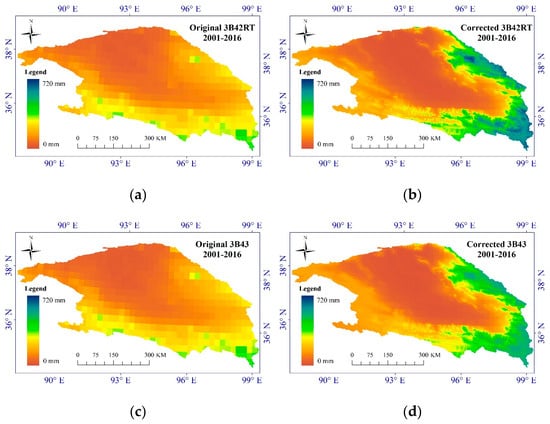 Comparison of spatial distribution of TRMM precipitation before and after correction. (a) Original 3B42RT precipitation; (b) Corrected 3B42RT precipitation; (c) Original 3B43 precipitation; (d) Corrected 3B43 precipitation.