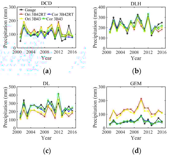 The annual precipitation time series and its variation trend of the gauged precipitation, original and corrected 3B42RT and 3B43 products at the 20 gauge stations are shown in Figure 8 and Table 4. From Figure 8 we can know that the original 3B42RT and 3B43 precipitation at the GEM, LH, NMH, XZH. HX, NCT and GEM4 stations, where the precipitation is low, is obviously higher than the gauged precipitation. On the contrary, the original 3B42RT and 3B43 precipitation at the CHH and SGB stations, where the precipitation is high, is obviously less than the gauged precipitation. This again indicates that the original 3B42RT and 3B43 are significantly overestimated in the LGPA and underestimated in the HGPA. What is nice is that the 3B42RT and 3B43 decreases or increases significantly and tends to the gauged precipitation values after the fusion model was corrected.