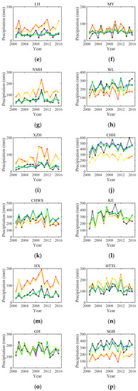 Comparison of the annual precipitation variation trend (2001–2016) between gauged and TRMM products on the grids with the gauge station. LH: LengHu; XZH: XiaoZaoHuo; GEM: GeErMu; HX: HeXi; MY: MangYa; NMH: NuoMuHong; GEM4: GeErMu4; DCD: DaChaDan; HTTL: HuaiTouTaiLa; GH: GaHai; NCT: NaChiTai; WL: WuLan; DLH: DeLingHa; DL: DuLan; CHWS: ChaHanWuSu; XRH: XiaRiHa; XRD: XiangRiDe; KE: KeEr; SGB: ShangGaBa; CHH: ChaHanHe; MAP: Mean Annual Precipitation.