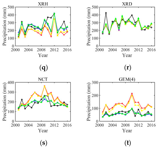 The annual precipitation time series of the gauged precipitation, original and corrected of 3B42RT and 3B43 products at the 20 gauge stations. (a) DCD: DaChaDan; (b) DLH: DeLingHa; (c) DL: DuLan; (d) GEM: GeErMu; (e) LH: LengHu; (f) MY: MangYa; (g) NMH: NuoMuHong; (h) WL: WuLan; (i) XZH: XiaoZaoHuo; (j) CHH: ChaHanHe (k) CHWS: ChaHanWuSu (l) KE: KeEr; (m) HX: HeXi; (n) HTTL: HuaiTouTaiLa; (o) GH: GaHai; (p) SGB: ShangGaBa; (q) XRH: XiaRiHa; (r) XRD: XiangRiDe; (s) NCT: NaChiTai; (t) GEM(4): GeErMu4.