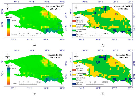 It can be seen from the Figure 9a,b that the precipitation in the northeast of the Qaidam Basin (Qilian Mountain area) showed a decreasing trend, while in the southeastern edge of the basin (east of the Kunlun Mountains) showed an increasing trend based on corrected 3B42RT and 3B43 products. It is obvious the precipitation slightly increased at the center and northwest of the basin. Figure 9b,d showed the significant test results of the precipitation change trend. We know that most areas of the Qaidam Basin were non-significantly increased or decreased, and only a small part of the areas passed the significant change test (Z ≥ 2.58).