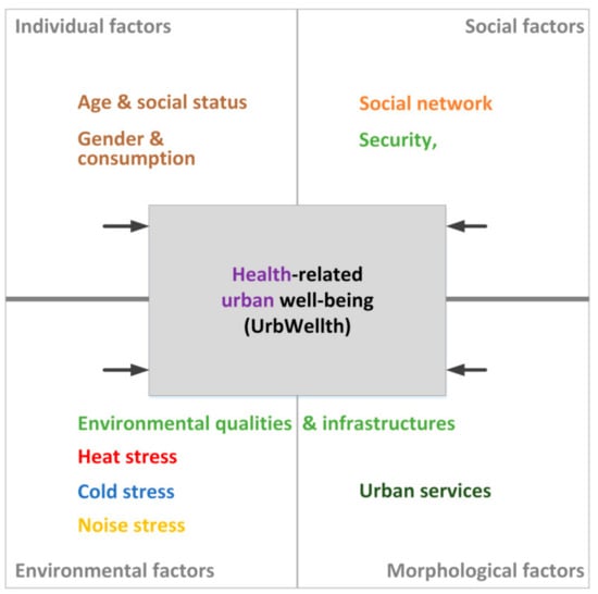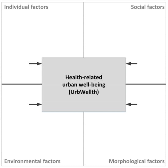 Szombathely et al. have presented a current overview of the development of the concepts of health in urban health research []. Based on this review, a conceptual model of health-related urban well-being (UrbWellth) has been elaborated that differs from existing approaches mainly in the analytical distinctions it suggests. The model introduces well-being [,] as the target value. Figure 1 shows a simplified version of the model of UrbWellth in order to present the general ideas behind the systematization of UrbWellth relevant to the analyses in this paper.