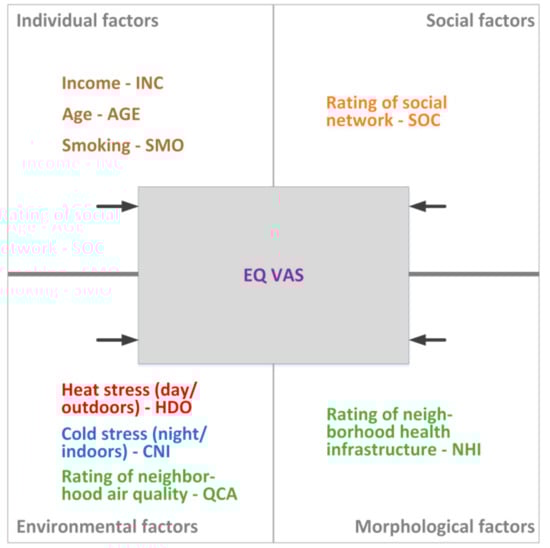 Of the remaining eight variables, three were identified as confounders: income (INC), age (AGE) and smoking behavior (SMO). Additionally, these factors are known to be the most important medical variables to access general health []. The remaining five variables that were identified as significant variables in the prognosis of health (EQVAS) were rating of one’s social network (SOC), rating of neighborhood air quality (QCA), rating of neighborhood health infrastructure (NHI), heat stress (day/summer/outdoors) (HDO), and cold stress (night/winter/indoors) (CNI). The main influencing variables determined thus represent only some of the urban components (factors 1, 4, 5, and 8). Nonetheless, variables from all sectors contributed to the elucidation of the dependent variable (Figure 3).