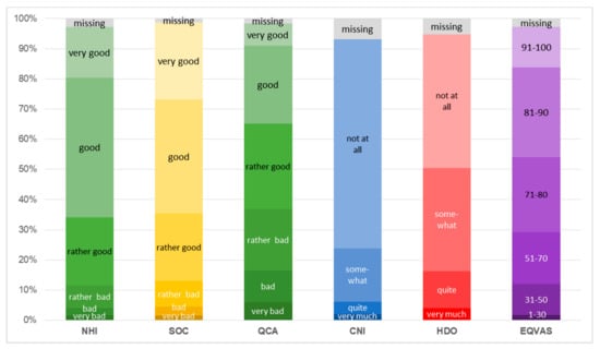 Finally, the rating of health infrastructure (NHI) revealed itself to be one of the most important variables in explaining EQVAS. Access to healthcare is known to play a role in specific health outcomes and should generally be considered in studies [,]. Improving health infrastructure has long been a central political demand towards the improvement of a population’s overall health, and has been supported by public health research [].