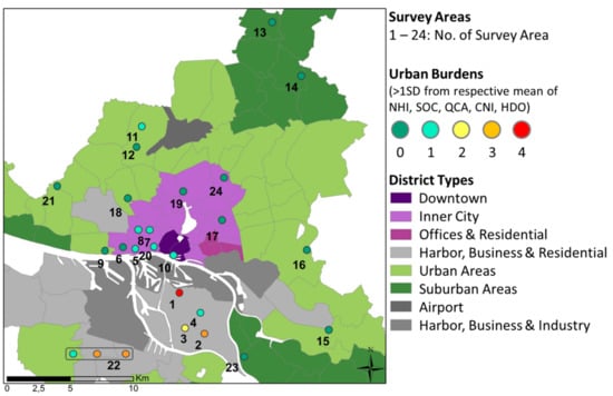 To answer the question of multi-influences or -stressors, the urban variables can be used to identify hotspots of aggregated burden (Figure 5). Taking into account the areas that deviate by more than one SD (from the respective mean values of the identified urban variables) shows that the burdens of urban life are distributed quite unevenly over the study areas. Three areas with a four-fold or triple burden can be identified: they are all located in the Wilhelmsburg and Hausbruch districts of Hamburg. These neighborhoods are also characterized by low socioeconomic status, making it even more appropriate to speak of a four-fold or five-fold burden.