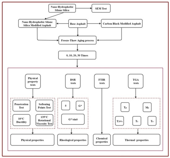 In summary, the addition of nanomaterials can effectively alleviate the impact of F-T cycle on asphalt. In previous studies, we evaluated the effect of nano hydrophobic silane silica (NHSS) on the degradation of asphalt mixture under F-T cycles, and established the damage model of NHSS modified asphalt mixture in spring-thawing season. Within this framework, the main goal of this paper is to evaluate the durability and property of nano hydrophobic silane silica modified asphalt under the Freeze-thaw aging process. To the authors’ knowledge, the open literature has no experimental studies of nano hydrophobic silane silica modified asphalt subjected to F-T aging process. In order to investigate the deteriorating properties of nano hydrophobic silane silica modified asphalt under Freeze-thaw aging process systematically, the penetration, softening points, ductility test, rotational viscosity test, dynamic shear rheometer test (DSR), Fourier transform infrared spectroscopy test (FTIR) and thermogravimetric analysis test (TGA) were employed in this paper. The penetration, softening points, ductility test and rotational viscosity test are conventional physical property tests that explore the deteriorating properties of asphalt from the perspective of physical properties, and the DSR, FTIR and TGA test was applied from the perspective of rheological properties, chemical properties and thermal properties, respectively. The research plane flowchart is shown in Figure 1.