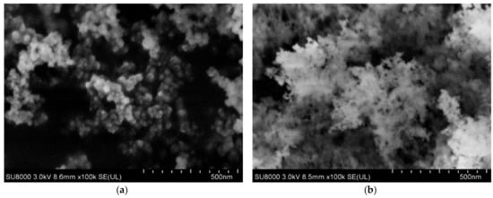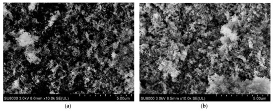 The microstructure of nanosilica and NHSS were examined by SU8000 electronic microscopy (Tianmei.co, in Japan). The scanning electron micrographs of nanosilica and NHSS observed at magnifying power of ×1000, ×10,000 and ×100,000, which are shown in Figure 2, Figure 3 and Figure 4. (a and b).