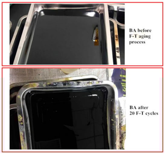As per the method described above, a complete freeze-thaw aging cycle was completed. Then, after 10, 20 and 30 freeze-thaw aging cycles, damaged samples were collected for physicochemical property test to explore the effect of NHSS modifier on the characteristics of asphalt under the freeze-thaw aging process. The photos of fresh and weathered specimen are shown in Figure 6.
