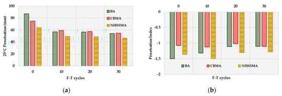 Penetration test results of modified and unmodified asphalt at different F-T cycles. (a) 25 °C penetration; (b) penetration index.