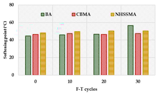 The results of softening point test for BA, CBMA and NHSSMA under the F-T aging process are given in Figure 8. It is can be seen from this figure that the softening point of asphalt were greatly affected following the incorporation of modifiers. From the softening point test, it was observed that the softening points of BA, CBMA and NHSSMA increases with the development of F-T cycles. This indicates that the F-T aging progress is beneficial to the high-temperature performance of asphalt. It can also be concluded that the softening point variation of modified asphalt is much less than unmodified asphalt after 30 F-T cycles, and modified asphalt is not sensitive to F-T aging progress, which is consistent with the penetration test results.
