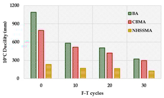The results of ductility test for BA, CBMA and NHSSMA under the F-T aging process are given in Figure 9. It can be seen from Figure 9 that the ductility of all asphalt gradually decreases with the increase of F-T cycles. This is due to the aging of the asphalt caused by F-T aging progress. As the aging process intensifies, the asphalt materials gradually harden, and the ductility of asphalt gradually decreases. The ductility of BA is greater than that of CBMA and NHSSMA under the F-T aging progress, which may be due to the destruction of homogeneity of the asphalt after the incorporation of particulate powder modifier. NHSSMA has the smallest ductility among the three types of asphalt, indicating that NHSSMA is more brittle.