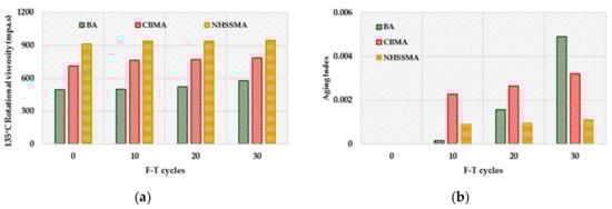As can be observed, 135 °C rotational viscosity and aging index for modified and unmodified asphalt under the F-T aging process are given in Figure 10. It can be seen that 135 °C rotational viscosity and aging index for modified and unmodified asphalt increases with the increase of F-T cycles. After 30 F-T cycles, the aging index of BA, CBMA and NHSSMA is 0.0049, 0.00321 and 0.0012, respectively. NHSSMA has the lowest aging index after 30 F-T cycles, indicating that the addition of NHSS can effectively resist F-T aging progress.