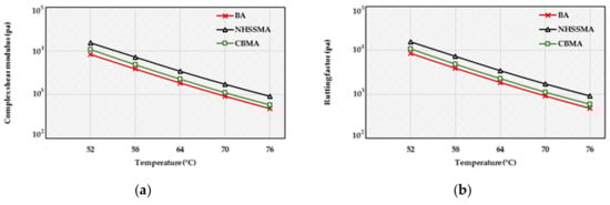 It can be seen from Figure 11, with the increase of temperature, the complex shear modulus of BA, CBMA and NHSSMA gradually decreases, but the phase angle shows an upward trend with the increase of temperature. This is because the increase in temperature causes the volume of free asphalt to increase, and the elastic state of asphalt at low temperature gradually shifts to the flow state at high temperature. The maximum shear stress of asphalt samples decreases, and the maximum shear strain increases gradually with increasing temperature in the dynamic shear test, so the complex shear modulus of BA, CBMA and NHSSMA gradually decreases with increasing temperature. Meanwhile, as the temperature increases, the viscous component in the asphalt increases and the elastic component decreases, so the phase angle increases with increasing temperature.