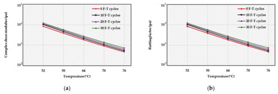 Since the generation and development of the freeze–thaw cycle damage is an extremely complex problem, the most cost-effective technique for mitigating freeze–thaw cycle damage and extending the service life of asphalt pavement is add modifiers. Nian et al. studied the influence of freeze-thaw cycles on the high-temperature characteristics of SBS-modified asphalt. The results showed that the incorporation of SBS modifiers could increase the elasticity of the bitumen significantly and slow the tendency of the bitumen’s complex shear modulus to increase with the freeze-thaw cycles to a certain extent []. Dong et al. concluded that crumb-rubber-modified (CRM) asphalt mixture had the outstanding freeze-thaw resistance through F-T cycles [].