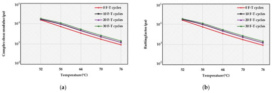 Complex shear modulus and rutting factor of BA at different F-T cycle. (a) complex shear modulus; (b) rutting factor.