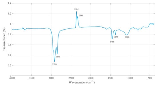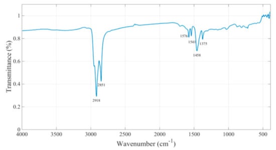 The FTIR spectra of the BA, CBMA and NHSSMA are given in Figure 14, Figure 15 and Figure 16. From the FTIR spectrum of BA, it can be seen that the strong absorption peak at 2918 cm−1 and 2851 cm−1 is the asymmetric and symmetric stretching vibration absorption band of C–H in aliphatic (mainly alkanes and naphthenes), and the peak at 1600 cm−1 is the C–C stretching vibration in aromatics, peaks at 1458 cm−1 and 1375 cm−1 is the in-plane bending vibration absorption peak of C–H in aliphatic, peak at 1032 cm−1 is the sulfoxide group (S=O) stretching vibration, four small absorption peaks in the range of 863 cm−1~724 cm−1 are the out-of-plane bending vibration of C–H on aromatic benzene rings. Thus, asphalt is mainly composed of saturated hydrocarbons, aromatics, aliphatics and heteroatom derivatives.