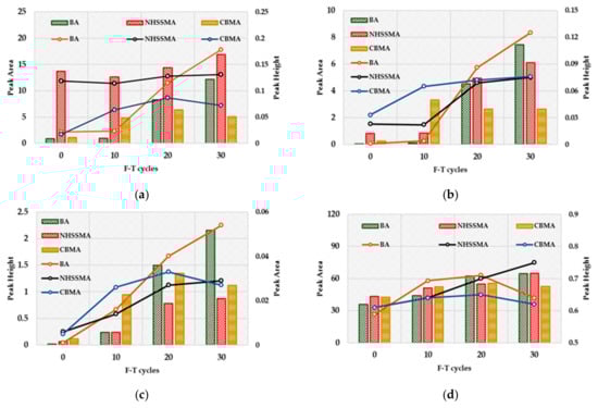 It can be clearly seen from Figure 17 that the peak area and peak height of the main functional groups for BA, CBMA and NHSSMA generally increase as the number of F-T cycles increase. Furthermore, the sulfoxide functional groups content index of BA, CBMA, and NHSSMA changes significantly under the F-T aging process. This is mainly because the polar molecules easily react with the organic sulfides of asphalt to form sulfoxide functional groups (S=O, 1032 cm−1) under the F-T aging process. Since the chemical activity of sulfur is higher than that of carbon, sulfur can participate in the reaction more rapidly under the F-T aging process. Moreover, the formation reaction of carbonyl (C=O, 1700 cm−1) and the formation reaction of sulfoxide group have a competitive relationship, so when the change in the amount of the sulfoxide group is large, the amount of change in the carbonyl group is relatively small.