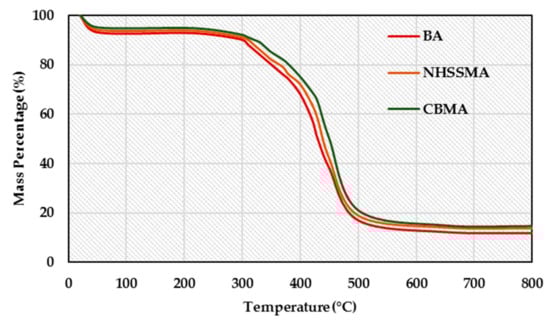 The thermogravimetric analysis (TGA) test results of BA, CBMA and NHSSMA without F-T aging process.
