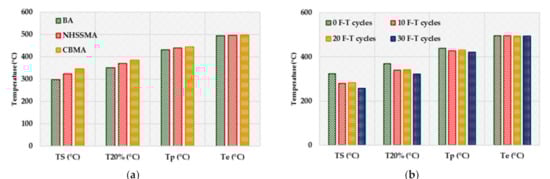 From TGA curves of all the asphalt samples, the following parameters were calculated for further comprehension of the effect of NHSS on the thermal properties of asphalt under the F-T aging process: (1) Start of thermal degradation (Ts, °C); (2) Temperature at 20% weight loss (T20%, °C); (3) Peak temperature (temperature at 50% weight loss) (Tp, °C); (4) End of thermal degradation (Te, °C); (5) Residual mass (Me, %). Table 8 and Figure 19 present a summary of TGA test parameters of BA, CBMA and NHSSMA at different F-T cycles.