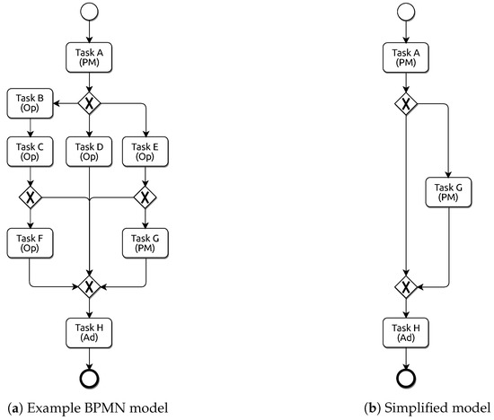 Other related works are those that deal with Business Process (BP) patterns [25]. The BP patterns are examples of process modelling that show how to connect activities within the workflow to solve a specific problem (i.e., synchronisation, parallel split, or exclusive choice, among others). To represent these patterns, a fully graphical notation oriented to human users is usually used. The Workflow Patterns Initiative has been working since 1999 in this field. The objective of this initiative is to provide a conceptual basis for business process design on different modelling perspectives (control flow, data, resource, and exception handling). Using the proposed patterns, the modelling stage of the business process is facilitated and a concise and straightforward workflow that adequately represents the desired behaviour is achieved. This goal has certain similarities with the one pursued by the present article. The BP patterns intend to approach the problem from the beginning, the modelling phase, while our proposal has another approach. A given model can change along its life cycle, so simplification in later phases, after the initial modelling stage, can be required. The following sections show actual situations (common in certain fields [26]) where it is required to remove a subset of the activities from a BPMN model. Under this premise, the simplification of the BPMN in the middle of its life cycle turns out to be of the utmost importance. In this context, the present proposal stands out, developing an alternative point of view and automating the task of simplification.