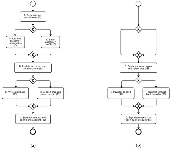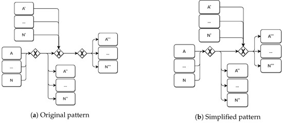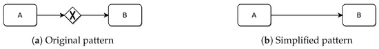 In the frame of the present work, a pattern is understood as a sub-part of a larger BPMN process model, i.e., a set of different elements (activities, gateways, connectors, etc.) with well-defined relationships. A pattern is considered as reducible (or simplifiable) if another pattern that represents the same behaviour than the first one but using fewer elements is possible. Figure 2a,b exemplify this idea with two simple patterns. As shown, the original pattern contains more sequence flows elements than the simplified one. However, replacing one block with the other one would not affect the behaviour of the global model. In the rest of the figures (Figure 3, Figure 4, Figure 5 and Figure 6), the reader can observe the other pairs of patterns in the repository. For example, in Figure 5, a pattern including three different Exclusive Gateways is presented. The reader can note that one of the Exclusive Gateways (the superior one) is not needed. Thus, it can be removed without losing any relevant feature. Its inputs will be the new inputs for the lower right gateway. Applying this simplification reduces the total number of elements in the new model.