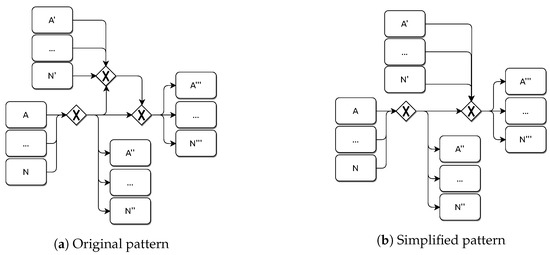 Taking into account the pattern repository, it can be followed that the pattern pool will contain two groups of patterns connected by a function. This function maps a set of reducible or simplifiable patterns (such as Figure 2a) to a set of simplified patterns (such as Figure 2b). Formally speaking, the function is surjective because there are different simplifiable patterns that can lead to the same simplified pattern.