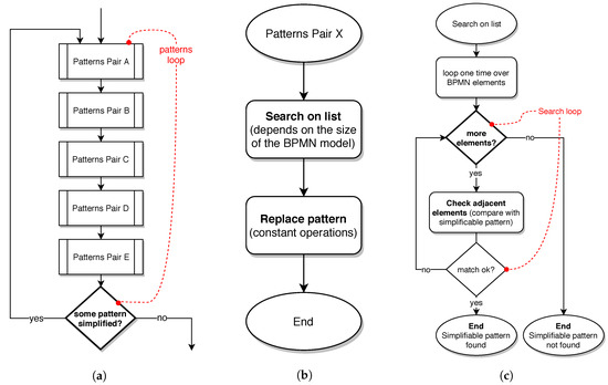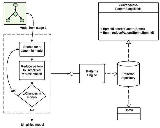 To fulfil this goal, the use of a formal and machine-understandable language to define the pairs of patterns would be useful. Thus, in a first stage, this language would be used to represent the pairs of patterns found. Subsequently, an automated software mechanism would translate these patterns into a representation that could be used for the simplification algorithm. In this line it is interesting to analyse the research themes of BP patterns [25], refactoring [27], anti-patterns [28], BPMV [18] or BPMA [11].
