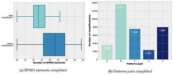 Throughout the 8102 cases considered, models needing a deeper simplification than others were found. Through the boxplot of Figure 12a, the reader can see the effect and the number of simplifications that have been made on the models of the dataset. In this chart, it is shown the effect of the second stage on the algorithm. As the reader can note, there is a clear trend towards obtaining models with fewer elements after the patterns simplification phase. The median with respect to the number of elements in a model has decreased from 33 (before the simplification process) to 23.