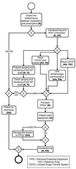 An additional evaluation has been carried out to verify the usability of the proposal in a real scenario. The authors have been working during recent years in several projects dedicated to issues related to traceability in a broad sense. In the due course of this researching activities, the authors have tackled the problems derived from hazardous medicines in the health field [48]. This leads us to propose extensions to the BPMN notation for its application in Hazard Analysis and Critical Control Points (HACCP) [26] scenarios or to the identification of gaps and needs for standardization of hospital protocols of a dangerous nature [49], among others. Given this trajectory, the proof of concept for this proposal was focused on the field of the management of hazardous drugs (HDs). HD are those drugs whose handling poses a danger to people (carcinogenicity, teratogenicity, reproductive toxicity, low dose organ toxicity, genotoxicity, among others) [50]. In [49], the authors focus their efforts on the identification of the stages that make up the life cycle of the HDs and, for each of them, certain action protocols are defined. Subsequently, in [51], an assessment is made of the advantages of applying the BPMN extension proposed in [26] for this domain of interest. In this work, 47 experts in the domain evaluated the benefits of the proposal. An adaptation of a BPMN model presented in this last work was selected to check the usability of the simplification proposal. The chosen BPMN model can be seen in Figure 13.