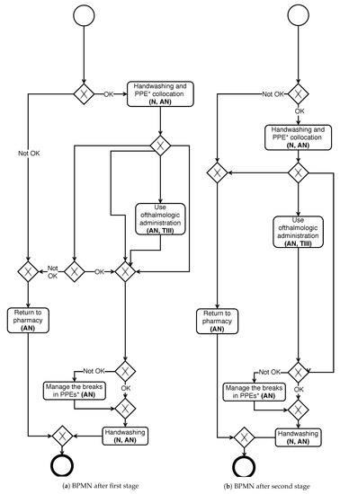 As a first example, let’s assume that a person with the AN role wishes to visualise only the activities involving his/her participation. Besides, he/she is only interested in those tasks involving ophthalmic administration, as this person only is capable of performing this procedure. In this line, the goal of simplification would be to produce a new simpler model that contains only the relevant information for this context. Applying the proposed two-phase algorithm, it would be possible to obtain the BPMN models shown in Figure 14a,b (output of stages 1 and 2, respectively). The model in Figure 14b represents in a much more synthetic way the relevant information for the AN role.