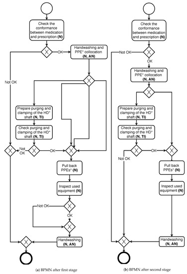 For the second example, let’s consider the case of a person also involved in the administration of the HD under the role N that wants to check the tasks that must perform. In this case, the list of activities removed in the first stage is different from the first example. The new resulting models generated for this new context are shown in Figure 15a,b.