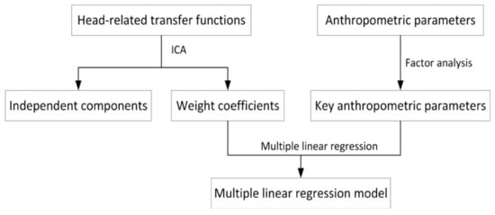 Figure 1 to obtain an HRTF ICA decomposition and multiple linear regression formula between weight coefficients and anthropometric parameters. On the other hand, the role of the validation group is to input the anthropometric parameters of the subjects into the constructed HRTF ICA decomposition and multiple linear regression formula of weights and anthropometric parameters to predict their individualized HRTFs. Finally, we compare it with the measured individualized HRTFs to show the performance of the proposed algorithm.