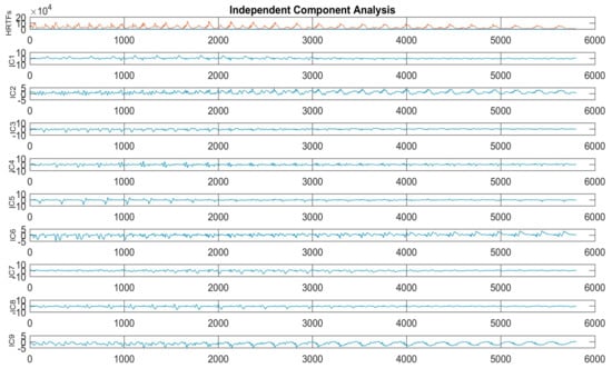 Equation (1) shows that an HRTF is a multivariate function that includes spatial sound localization, frequency, etc. Therefore, it is necessary to employ an appropriate decomposition method to reduce the dimensions and extract characteristics. ICA is an effective method for decomposing large amounts of data, and has been widely used in brain/speech signal processing, wireless communication, feature extraction, data mining, fault diagnosis, and other fields [