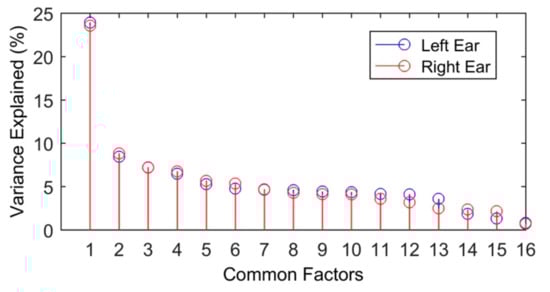 F. According to Equation (14), the variance contribution rate was calculated and the above 16 factors were selected with a rate of about 90%. The variance contribution rate of the 16 factors from the left and right ears are shown in