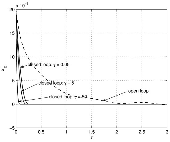 Denote , , , , , and . Then, the equation (32) can be presented in the form of (1). Table 1 contains a list of the circuit and controller parameters. The values for these parameters have been chosen mostly heuristically, trying to cover the largest possible range of parameter variability. In order to achieve particular system performance objectives, a proper performance index shall be defined, and values of the parameters can then be obtained as a result of solving the optimization problem. This type of optimization problem can be quite easily solved by using numerical optmization methods. It is also easy to check that Assumptions 1–3 are valid. The simulation results are shown in Figure 2, Figure 3, Figure 4, Figure 5, Figure 6, Figure 7 and Figure 8. The results confirm the property of finite-time convergence of the closed-loop system, as well as robustness to disturbances.
