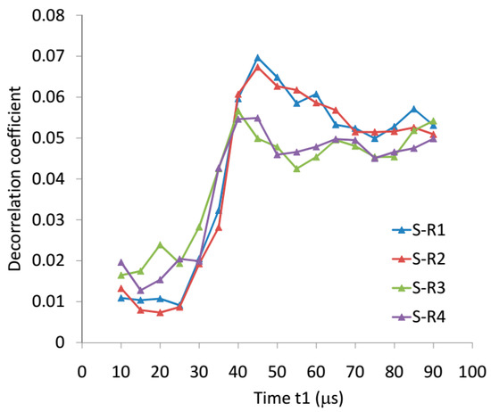 in which the window length T = t2 − t1 is set to 10 μs and the beginning of the time window t1 is shifted sequentially with a time step of 5 μs each time. The stretching factor is chosen to vary from −0.015 to 0.015, from which the decorrelation coefficient is decided when reaching the minimum (Figure 4). The total results for all decorrelation coefficients varied with time are shown in Figure 5. They all increase with time as a growing interaction between the diffuse wave field and the defect takes place. The maximum coefficients are found when t1 = 45 μs, which is chosen for the defect localization study. S-R1 and S-R2 are more sensitive to the defect compared to that of S-R3 and S-R4 due to their different positions relative to the defect. After t1 = 45 μs, the decorrelation coefficients decrease because of the reflection part interference and signal attenuation.