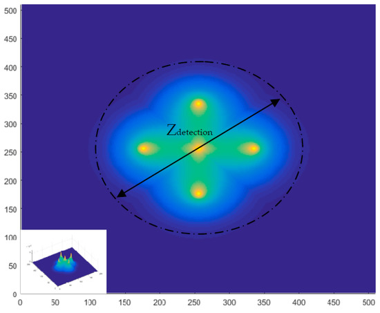 The defect sensitivity kernel represents the probability of a wave sent from location S to pass at location x and then to arrive at location R after period of time t [11]. Considering the source images due to the four straight boundaries of the plate, the detection diameter Zdetection is 260 mm when t = 45 μs, as shown in Figure 6 based on Equation (5). The diffuse wave field is mostly sensitive to the defect in this range. In fact, the diffusion model simplifies the energy distribution and neglects the diffuse field-defect interaction after t = 65 μs, as previously shown in Figure 2. All the pressure amplitudes are equal to zero in that period. The whole space is then discretized into 300 × 300 elements for the possible location of the defect, and a further mesh refinement gives no more localization resolution improvement.