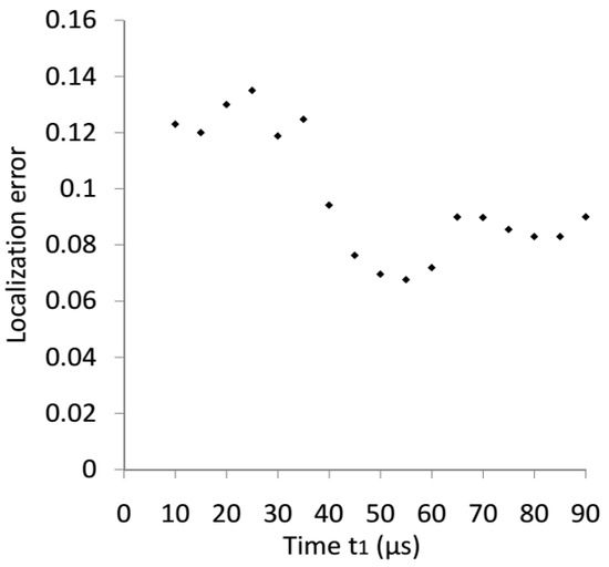 Once the decorrelation coefficients and kernel function have been calculated in the defined time domain, the localization is found to be in [270 mm, 265 mm] based on Equations (4)–(7), as shown in Figure 7. A further comparison is made among different time windows in Figure 8. The localization error varies from 13.5% to 6.7%. It decreases initially due to the increasing interaction between the diffuse wave and the defect. The direct reflection wave is estimated to arrive at the defect position at . Subsequently, the localization error increases because of the lowering sensitivity of the waveform to the defect shown in Figure 5, which may be caused by the reflection and attenuation. Although they suffer a lot from attenuation, which limits the inspection domain, a meaningful signal can still be extracted.