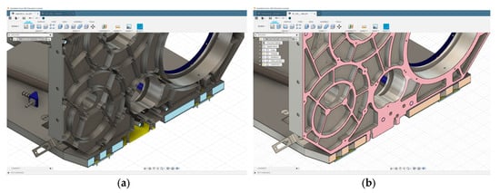 In the following pair of figures (Figure 2a,b) the received model (located on the left) and the model converted to solid are displayed. In the original file, solid geometries are perceived in the lower part of the subassembly, while in the rest, no cuts are generated because they are surface geometries. However, once the primitive geometry has been modified to solid geometry, the cut is visible throughout the sectioned part.