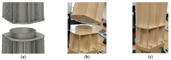 (a) View of the reinforcement connection between the two parts in which the piece has been divided. (b) Piece printed in two parts. (c) View of assembled printed pieces.