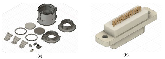 Once the number of pieces to be printed has been reduced, it is necessary to assign which parts are printed with each 3D printer, depending on the need for resolution, or with the cutting machines, if they have laminar geometry. In order to reproduce very small pieces on a natural scale, photosensitive resin printing was used. This system has manufactured, among others, the connector of Subassembly 8 (one of the 14 pieces) due to the diameters of the pins. This analysis is performed for every part of each assembly. In Figure 8a the connector of the Subassembly 8 is exposed in context to the rest of the elements that form it and in Figure 8b a detail view of the connector.