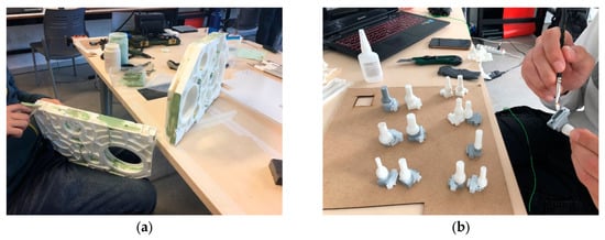 Once the geometric modifications and the adjudication of the digital manufacturing machines have been made, it is necessary to make modifications in the printed elements in order to generate a uniform HDM in terms of texture and color. Figure 11a shows an example of joining pieces that had been printed in several parts, and in Figure 11b the process of painting to match the color.