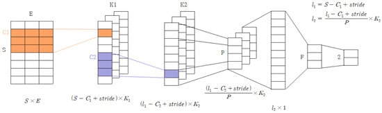 The S × E matrix, the output of the embedding layer, is then laid down as the first convolutional layer. The first convolutional layer is the × E matrix, which stores the local information needed to classify the sentiment class in a S × E matrix and convey information to the next convolutional layer. The × E matrix slides (i.e., convolves) all the values of the S × E matrix with an arbitrary stride, calculates the dot product, and passes the dot product result to the next layer. The second convolutional layer uses the × 1 matrix to extract features from the contextual information of the main word based on the local information stored in the first convolutional layer. and denote the filter size of each convolutional layer, and the two convolutional layers have and distinct filters, respectively, to capture unique contextual information. In other words, the first convolutional layer is utilized to look at simple contextual information while looking over the S × E matrix, and the second convolutional layer is utilized to capture key features and then extract them (e.g., worst, great) that contain sentiments affecting classification.