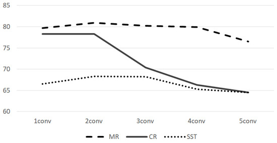 If MR data adopted global max-pooling, the large number of missing values would be discovered. Because the length of the total sentence of the MR data was longer than that of CR data and SST data, the performance of the MR data was lower. On the other hand, CR data and SST data with relatively a short length of sentences were not degraded even when using global max-pooling and, in some cases, performed better than using max-pooling. As a result, CR data and SST data showed the highest performance when one convolutional layer and global max-pooling layer were combined. The reason is also that they were shorter and simpler data than the MR data, so they showed higher performance in relatively monotonous models. However, The network with two convolutional layers never lagged behind the traditional machine learning models and state-of-the-art models in terms of performance in this experimental result.