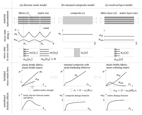 Existing approaches to modeling of this tensile behavior can be roughly classified into three categories summarized in Figure 1. The theoretical descriptions based on discrete representation of the matrix cracking process and debonding between matrix and reinforcement displayed in column (a) of Figure 1 considers an elastic-brittle behavior of fabrics and matrix material components. In this model, the nonlinear strain-hardening response results from the evolution of discrete cracks emerging along the specimen with random matrix strength and nonliner bond stress—slip relation [16,17]. The ambition of this modeling approach is to predict the strain-hardening behavior of a particular cross-sectional design using the parameters of the material components and of the bond between the concrete and fabrics [18].